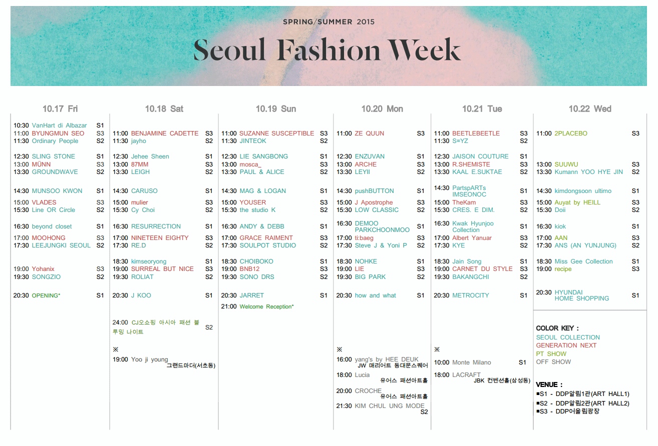 Seoul Fashion Week 2015 S/S schedule ファン生活 2014年10月18日 後知後覺SONGZIO老師的秀結束了……車勝元還是很帥然後我完全認不出那個在Instagram狂洗版的人是李正信赫秀啊還有機會看你再上伸展台嗎? PR